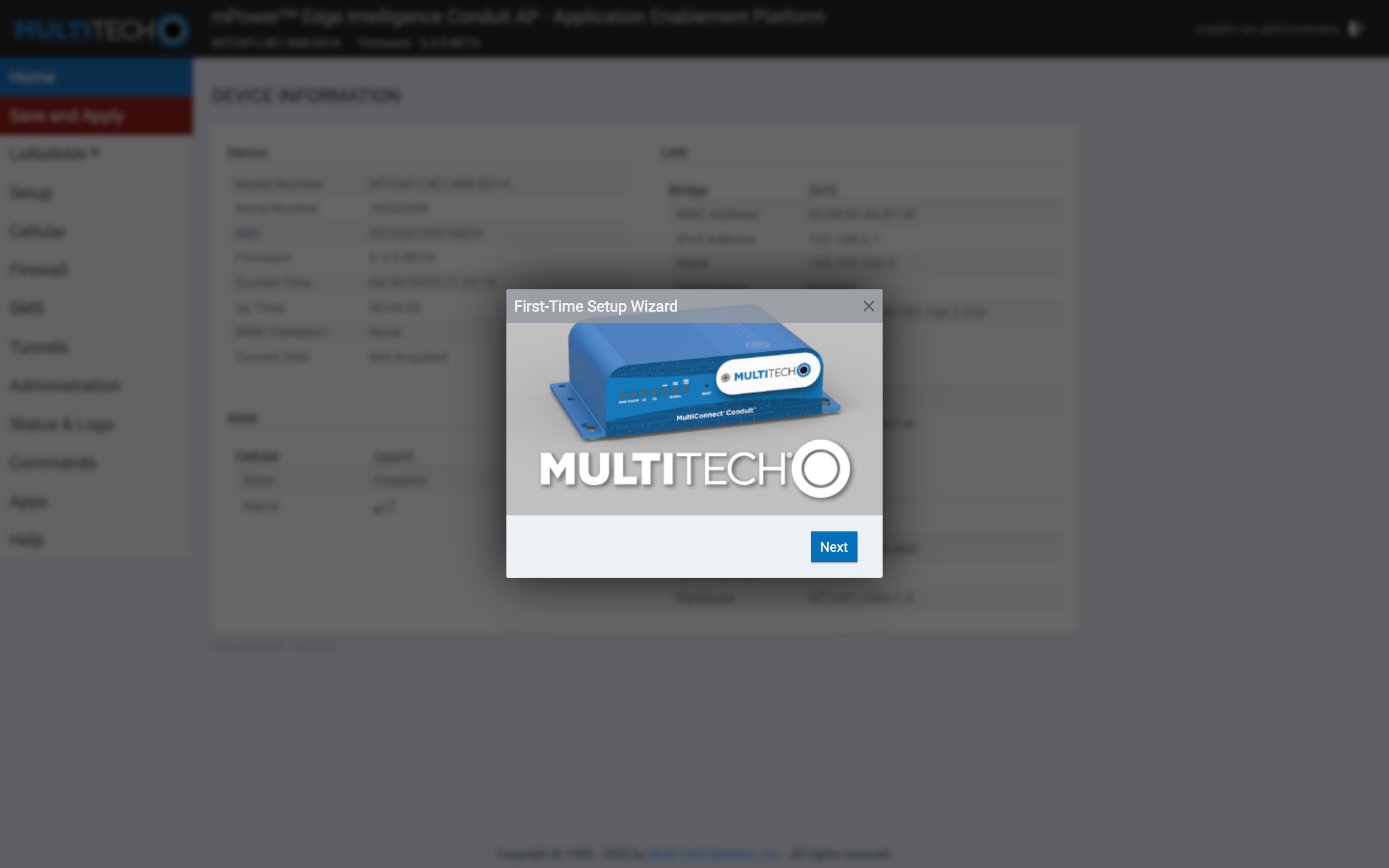 For the first-time hardware and software setup, you can refer to the appropriate configuration guide on the Multitech documentation page.