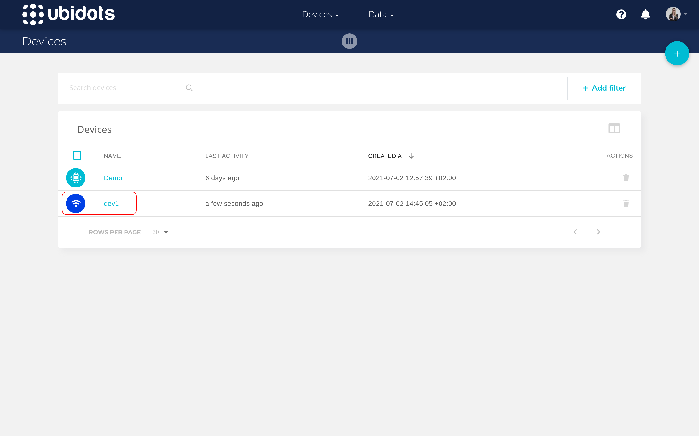 After you have completed the integration, navigate to Devices menu. You will see your end device appearing in the end devices list as soon as it sends an uplink message.