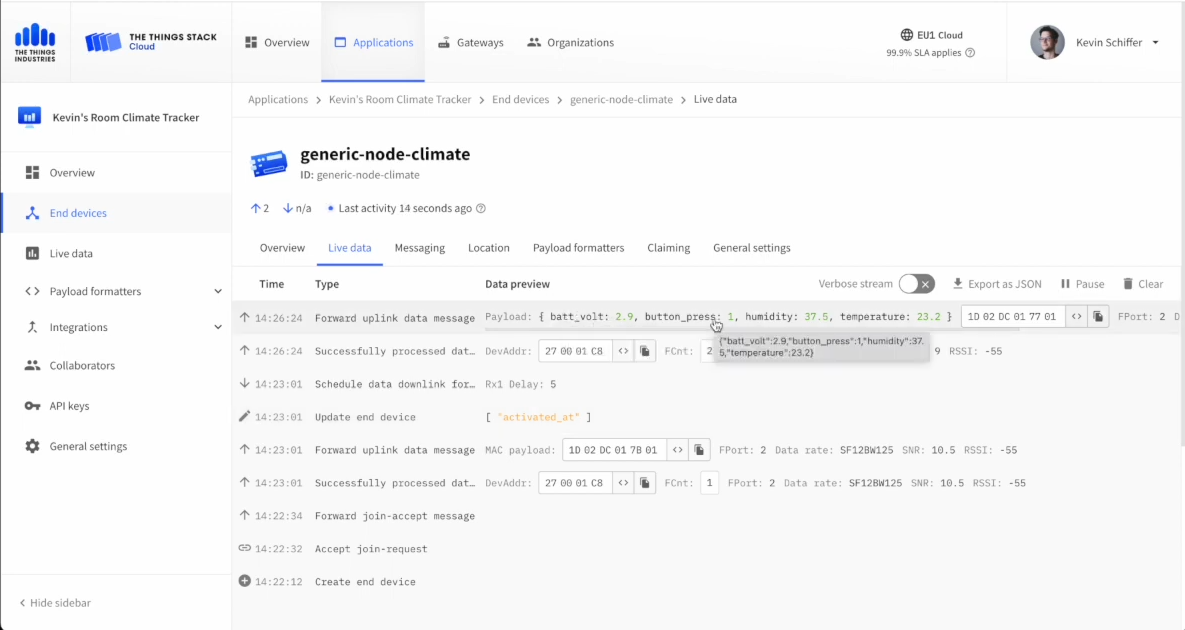 Now go back to the Live data tab and press the user button on GNSE. The payload of the uplink data message gets decoded as shown below: